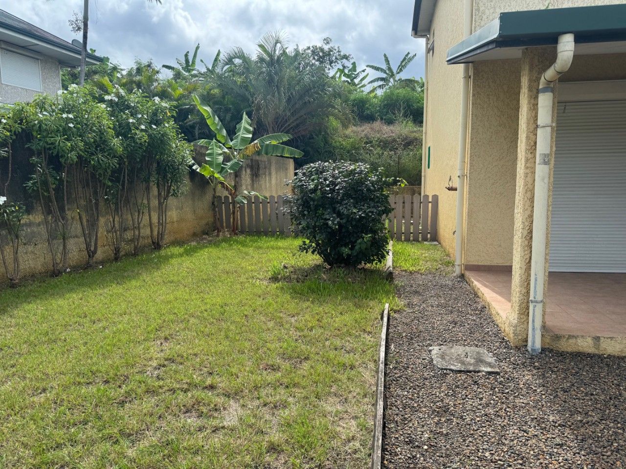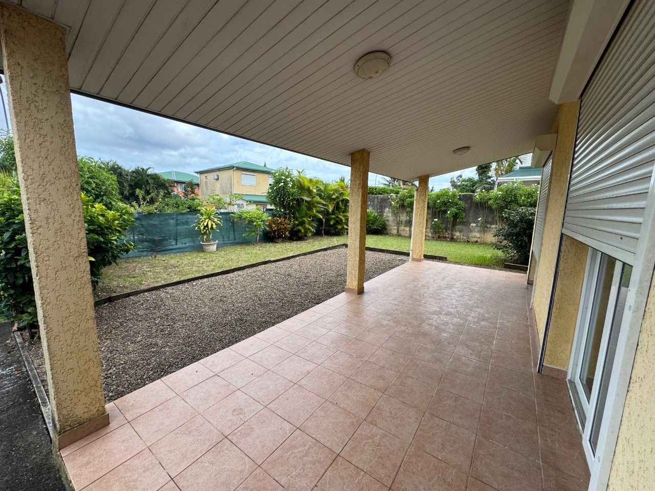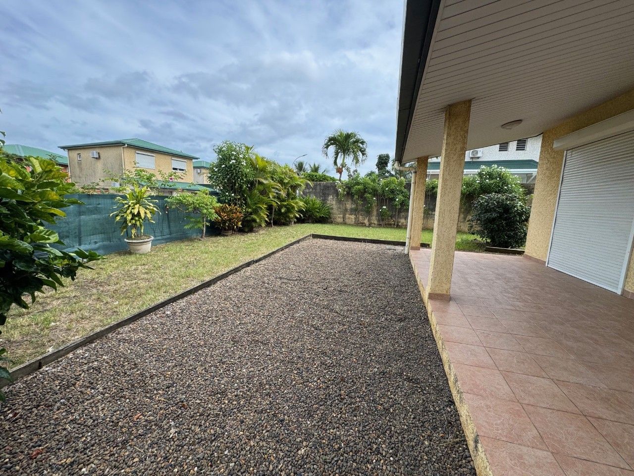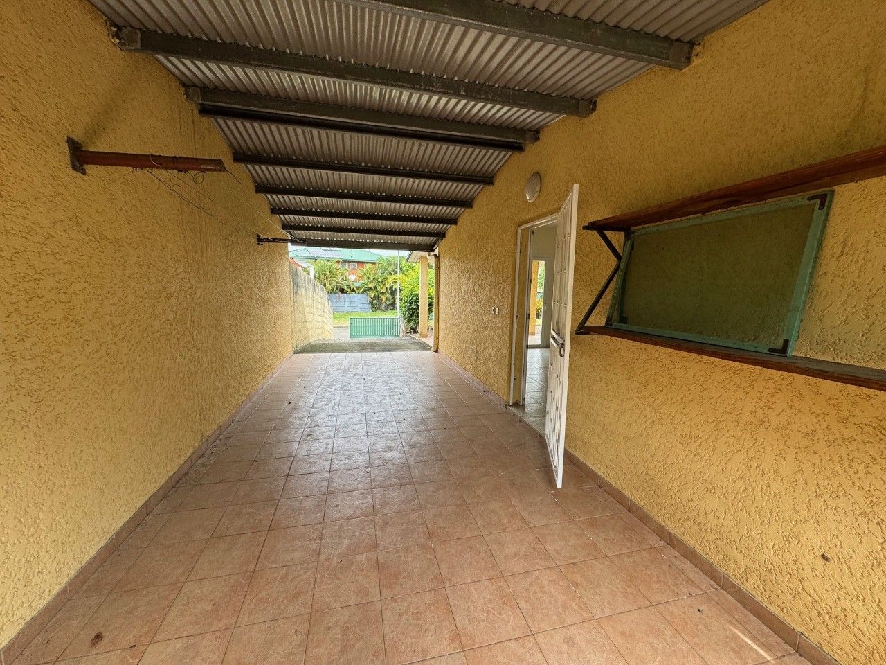 Un carport pour voiture, terrain entièrement clôturé, portail.