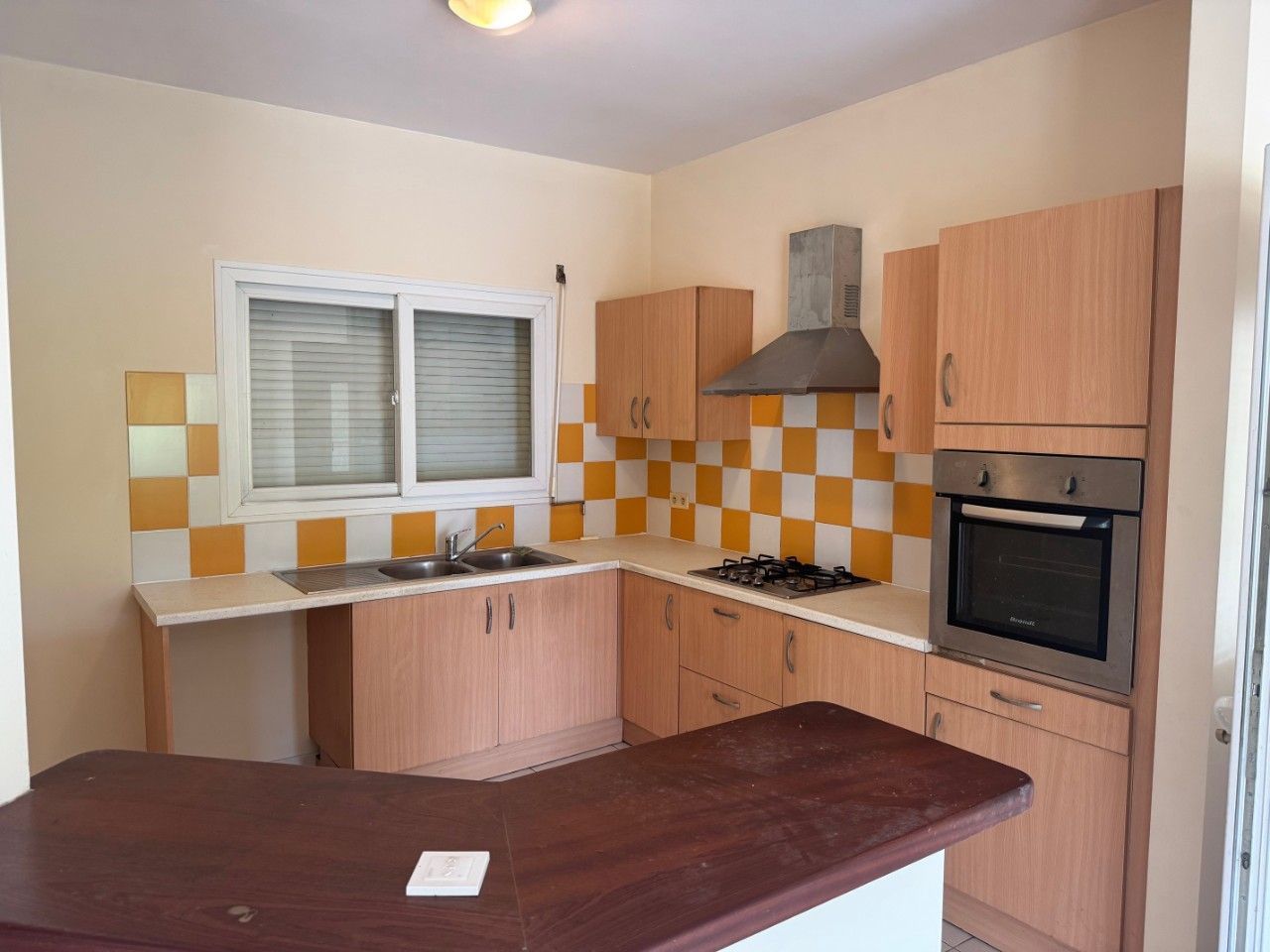 Un séjour avec coin cuisine équipée et aménagée, une buanderie, un WC, une terrasse.