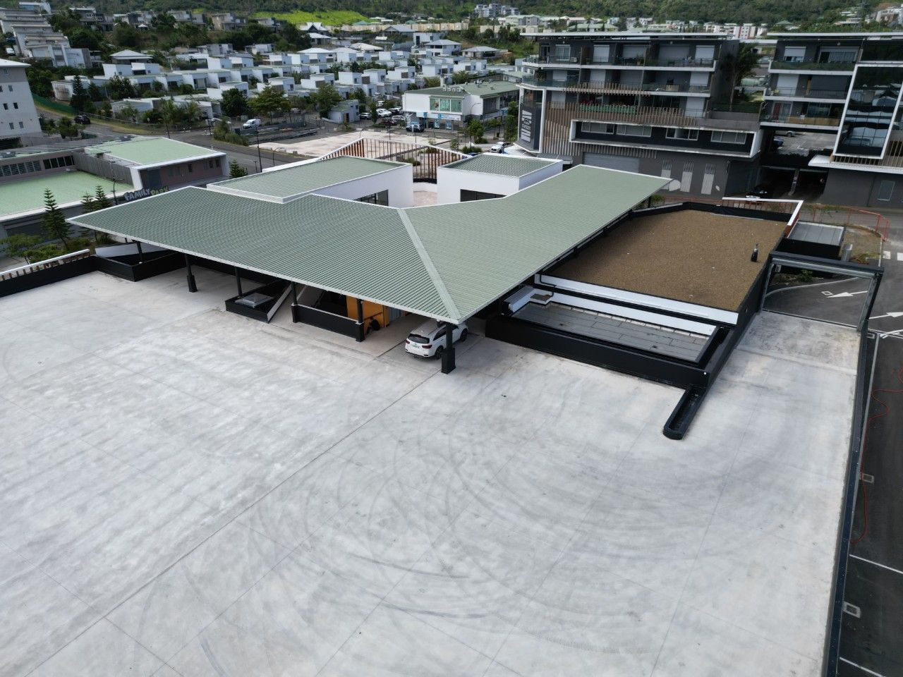 Centre commercial avec plus de 40 places de parking.